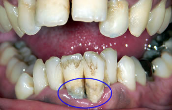 歯垢と歯石が歯について、歯ぐきが下がっています。